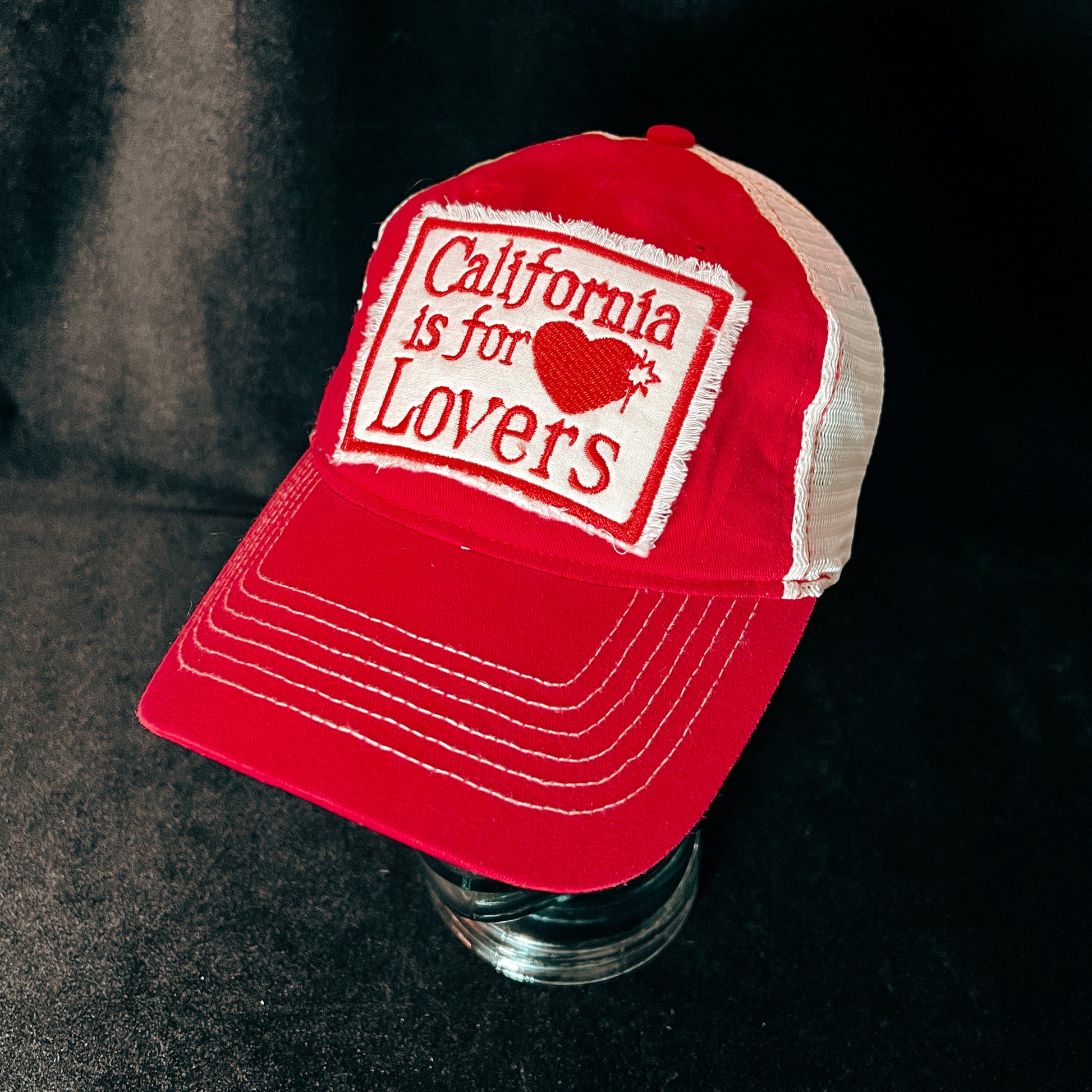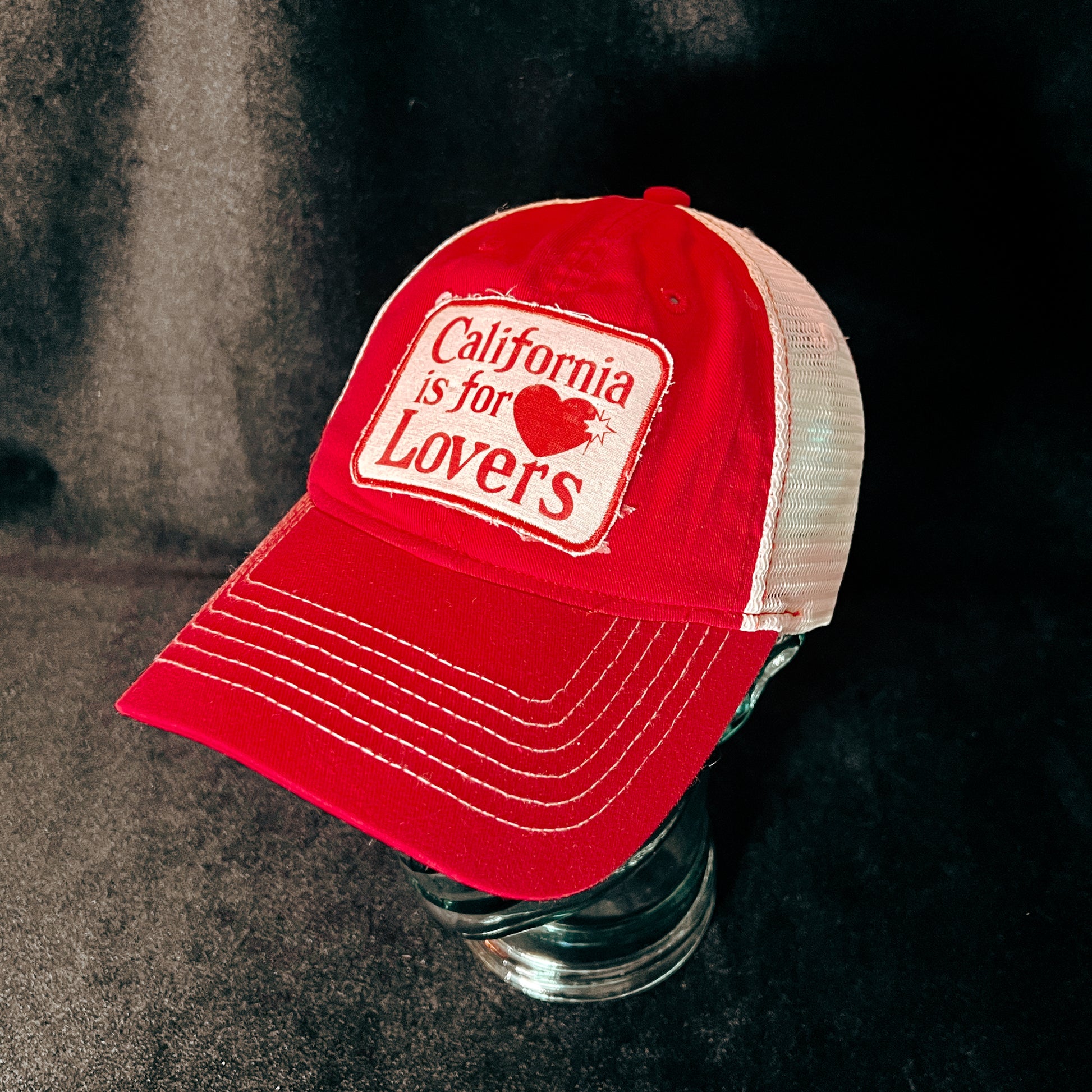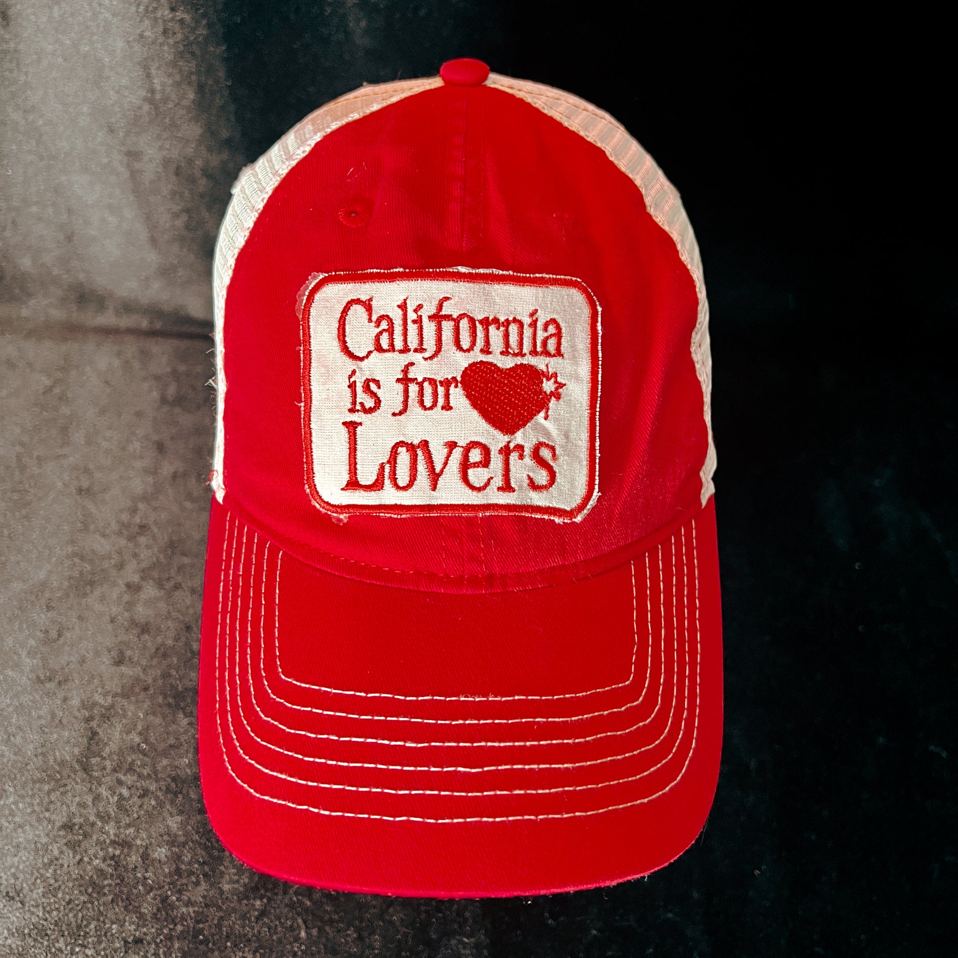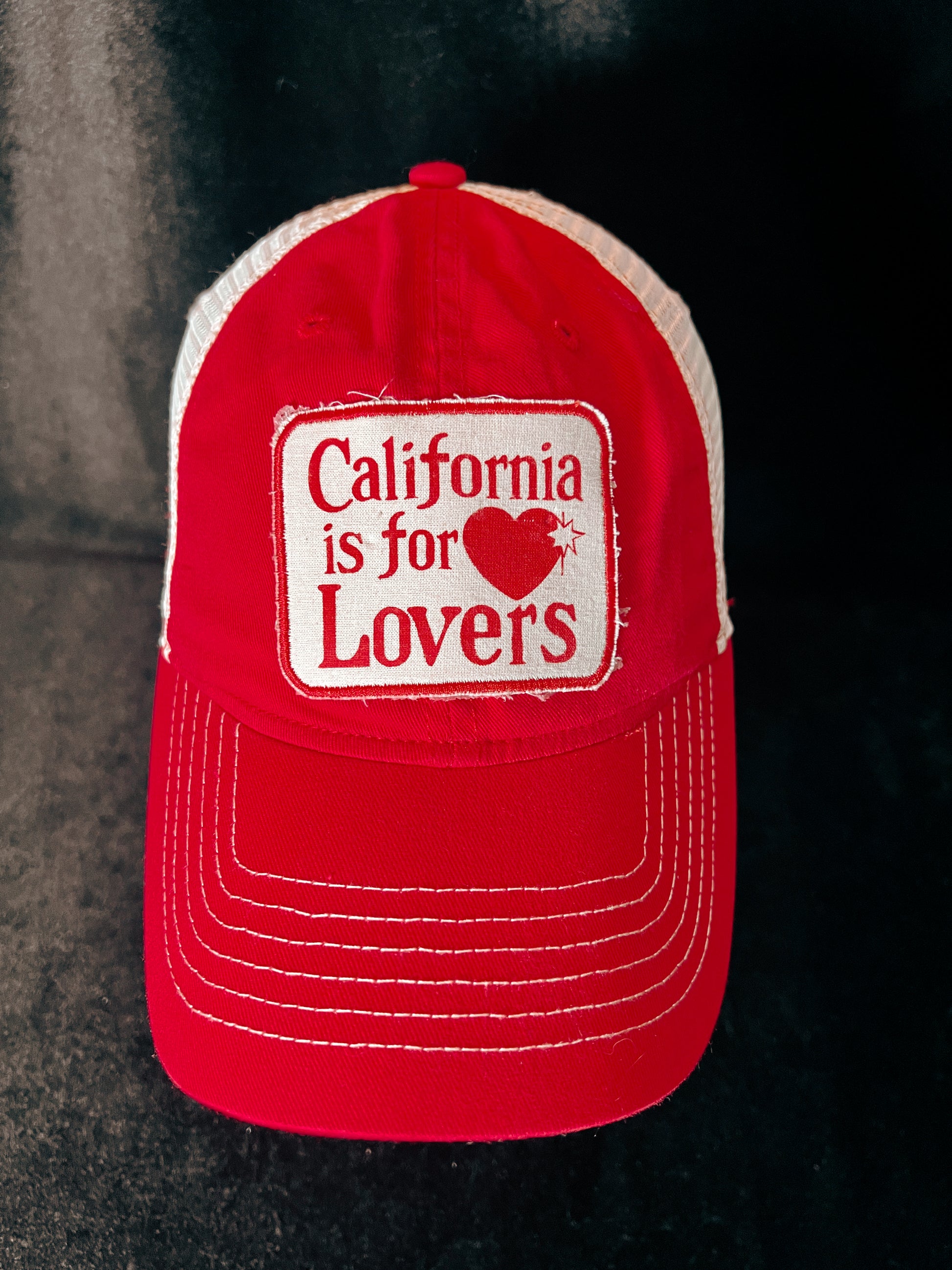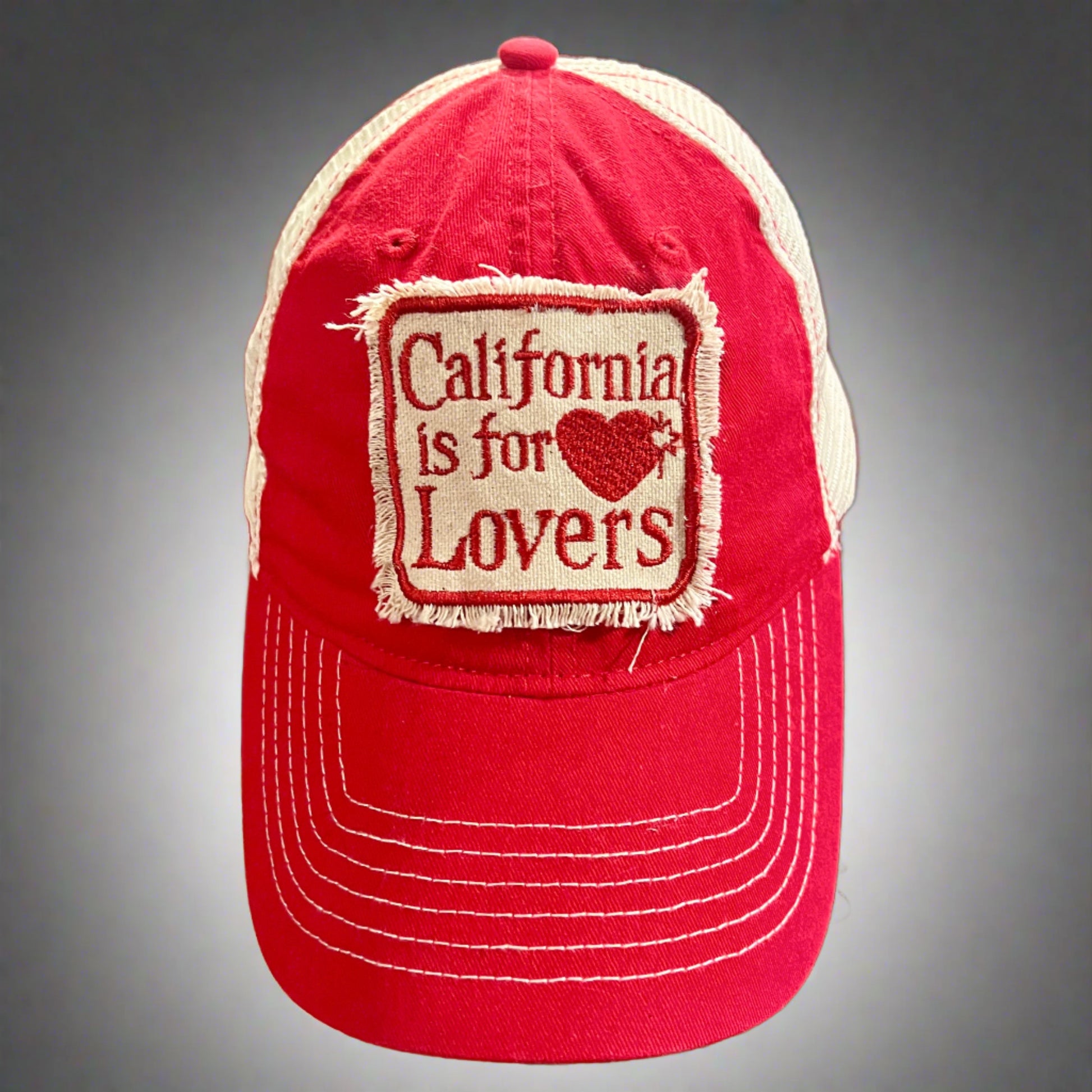 The hat features a bold embroidered or painted patch that reads "California is for Lovers," with a well-loved tattered look.