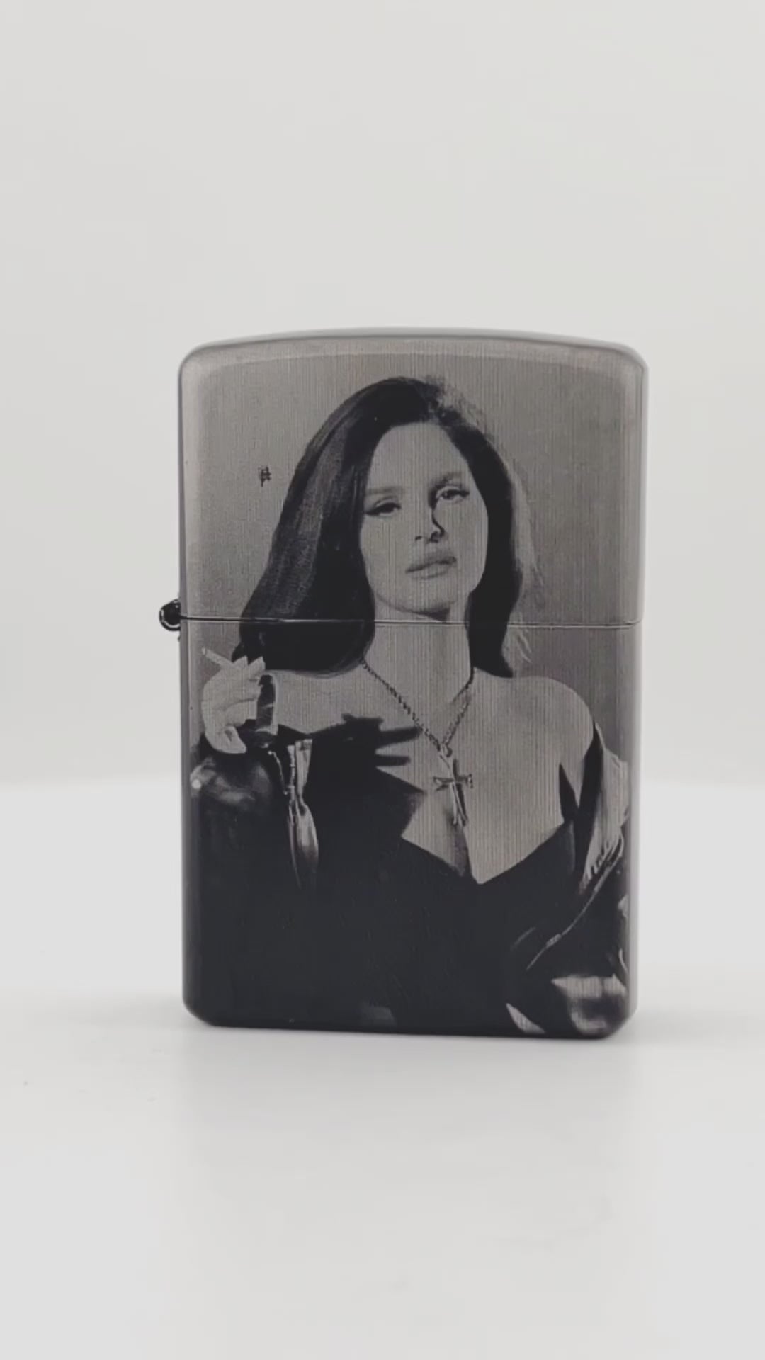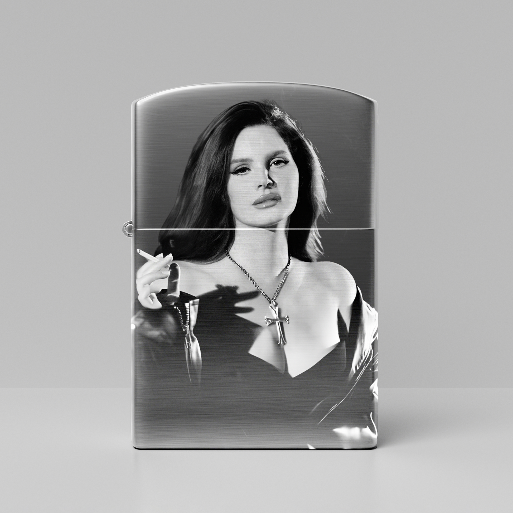 The entire front side of the lighter is engraved with a stunning photo of the iconic singer and songwriter Lana Del Rey smoking a cigarette, creating a unique and eye-catching design.