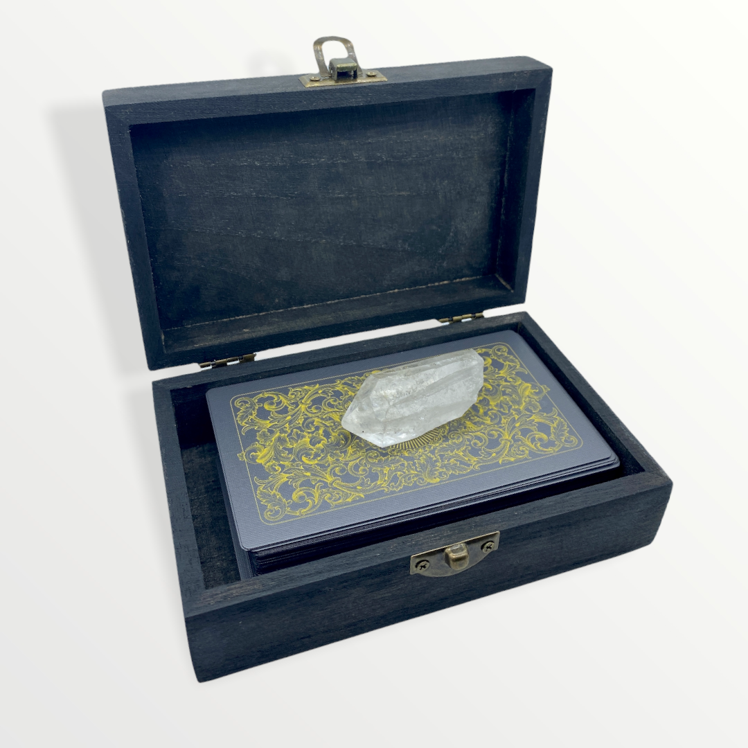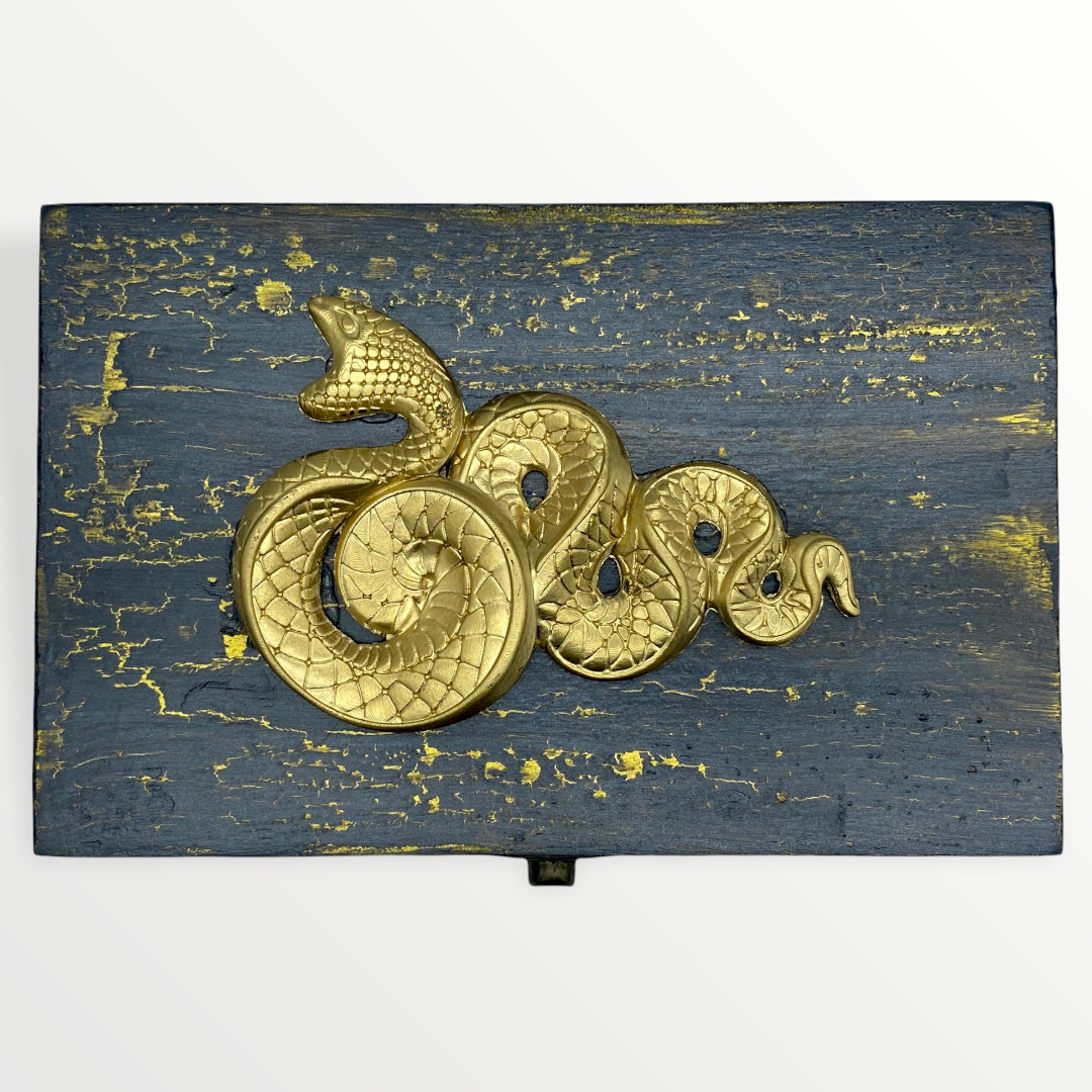 This little box is the perfect size to store your tarot or oracle cards in! The top is adorned in a black and gold crackle finish with a gold serpent front and center. The rest of the box is stained black and features a durable clasp to keep the lid secured.